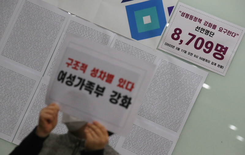 17일 오전 서울 영등포구 여성미래센터에서 열린 '성평등 정책 강화를 요구한다' 여성·시민 긴급 기자회견에서 선언 연서명에 참여한 8709명이 남긴 말과 명단이 붙어있다.