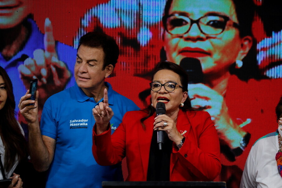 온두라스 대통령 당선자인 시오마라 카스트로(오른쪽)가 지난달 28일 테구시갈파에서 대선 이후 연설을 하고 있다. 테구시갈파/로이터
