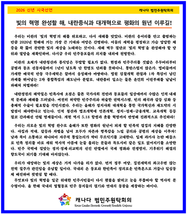 새해벽두 미국 트럼프 정부의 베네수엘라 침공과 마두로 대통령 ‘납치’사태에, 캐나다는 물론 국제사회가 충격과 불안을 감추지 못하고 있다. 트럼프 대통령은 ‘다음 대상’도 노골적으로 거론, 미주는 물론 동맹이던 ‘불량 이웃’에 유럽까지 반발하며 위기감이 번지고 있다. 국제사회는 이번 사태가 단지 한 나라 장악이나 석유 이권만이 아닌 ‘트럼프식 팽창주의’, 곧 '돈로 독트린(Don-roe Doctrine)'의 발현이며 신제국주의적 무질서 시대가 우려된다는 분석이다.
