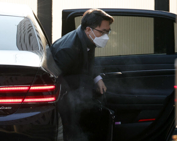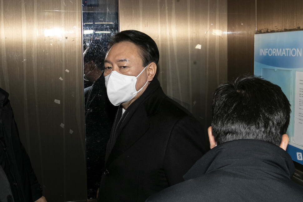 윤석열 국민의힘 대선 후보가 3일 오전 갑작스럽게 이후 일정을 취소하고 서울 영등포구 국민의힘 당사 승강기에 오르고 있다.