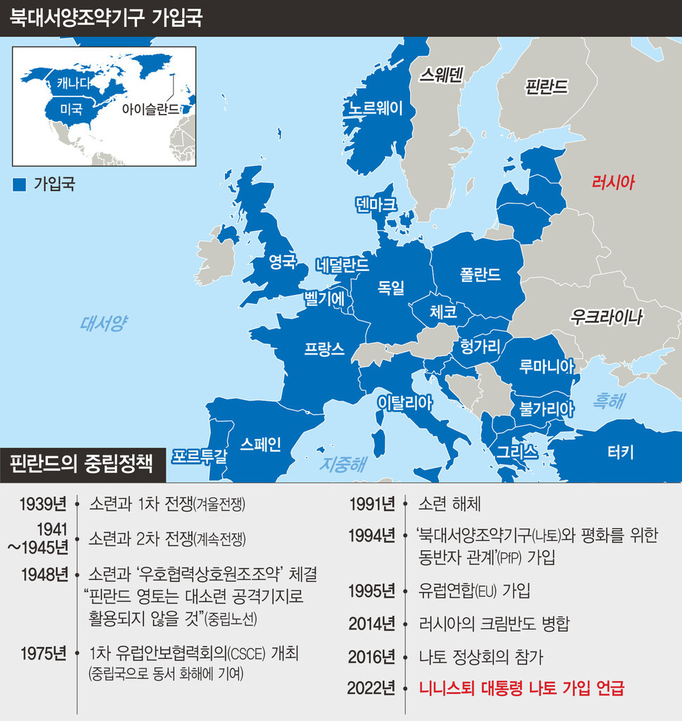 이런 발언은 과거 핀란드가 오랫동안 유지해온 군사 비동맹과 중립 노선에서 한참 벗어난 것이다. 핀란드는 1939~1940년 겨울전쟁 등 소련의 침공을 겪은 역사적 사실을 교훈 삼아, 1340㎞ 길이의 국경을 맞대고 있는 러시아와 우호 관계를 유지하는 데 많은 노력을 기울였다. 2차대전 직후엔 미국의 유럽원조계획인 ‘마셜 플랜’을 거부하고 나토와 바르샤바조약기구 어디에도 참여하지 않았다. ‘핀란드 영토가 소련에 대한 공격기지로 사용되지 않도록 하겠다’고 공개 약속도 해줬다.