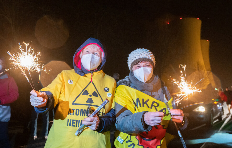 올해 1일 반핵 운동가들이 독일 니더작센주 에머탈 그론데 원전 폐쇄를 축하하고 있다. DPA/연합뉴스