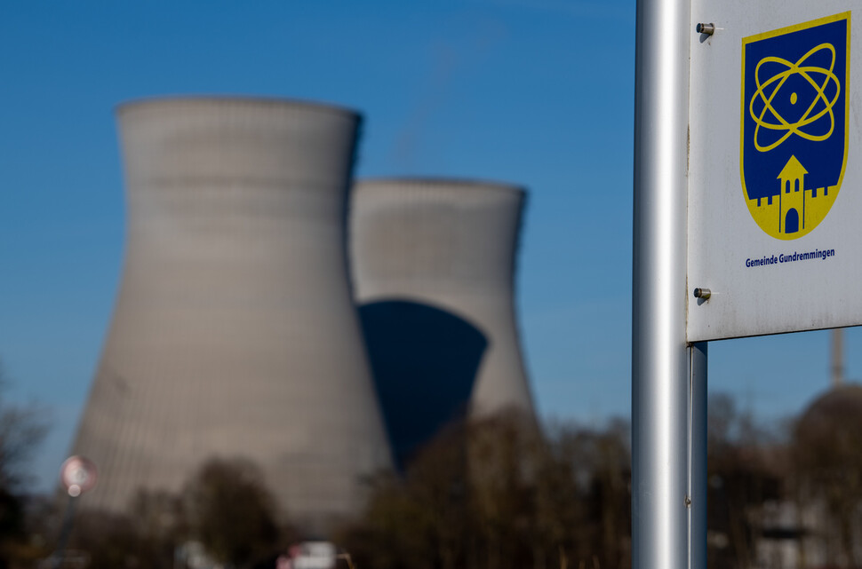 지난 1일 독일 바이에른 군드레밍겐 주 원자력 발전소의 냉각탑 앞에는 원자력 로고가 새겨진 도시 문장이 표시되어 있다. DPA/연합뉴스