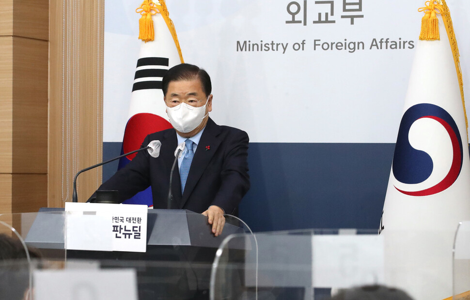 종전선언과 관련해 정 장관은 “한-미 간에 그 중요성에 공감을 하고 있고, 문안도 이미 사실상 합의가 돼 있는 상태”라고 밝혔다. 정부 고위인사가 직접 한·미가 종전선언 문안에 합의했다는 사실을 확인한 것은 처음이다. 정 장관은 “종전선언과 관련해 중국 쪽을 통해 북한의 입장을 전달받은 것은 없다”며 “북한과의 협의를 어떻게 진전시켜야 될지에 대해서는 여러가지로 검토를 하고 있다”고 말했다. 이제훈 기자