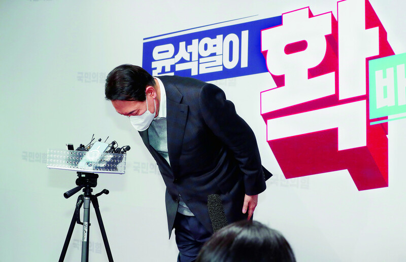 윤석열 후보가 지난 17일 오후 서울 여의도 당사에서 부인 김건희씨의 ‘허위 경력’ 논란을 사과한 뒤 고개 숙여 인사하고 있다.