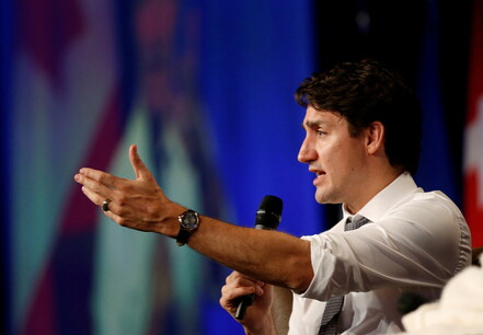 저스틴 트뤼도 캐나다 총리가 21일 앨버타 캘거리 상공회의소에서 연설하고 있다. 캘거리/로이터 연합뉴스