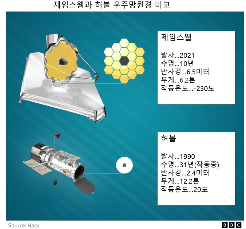 주로 가시광선으로 관측하는 허블과 달리 제임스웹은 적외선으로 별을 본다. 이를 위해 지름 6.5미터의 반사경과 4개의 적외선 관측 장비를 갖췄다.