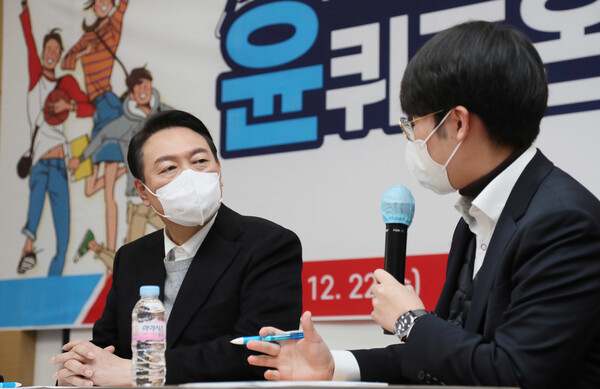 윤석열 국민의힘 대선 후보가 22일 오후 전북 전주시 덕진구 전북대학교에서 학생들과 타운홀 미팅을 하고 있다. 연합뉴스