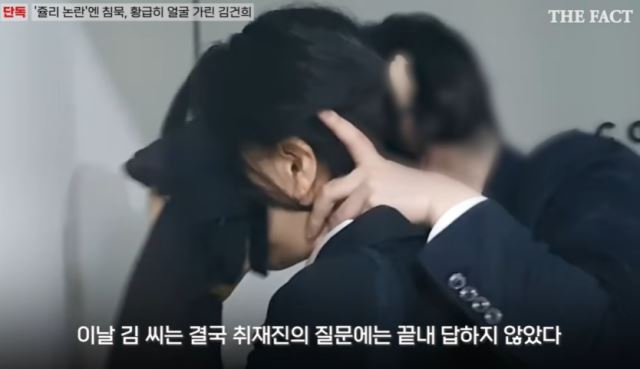 지난 14일 <더팩트> 카메라 앞에서 급히 피하는 김건희 씨 모습.