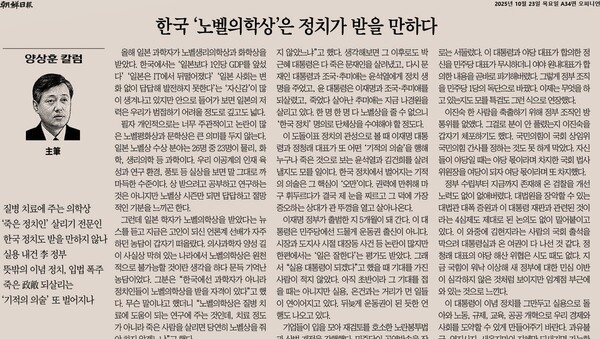 '방가조선일보' 양상훈 주필이 10월 22일에 ‘한국 '노벨의학상'은 정치가 받을 만하다’라는 제목으로 칼럼을 썼다. 그야말로 발칙한 주장이 아닐 수 없다. 한국 정치가 정치적으로 죽은 자를 살려내는 재주가 있다며 비아냥거리는 짓이다. 양 씨는 본인 말이 아니라며 따옴표를 썼으니 그를 탓할 일은 아닌 듯도 하다. 다만 방가조선일보가 노골적으로 보여주는 일본 바라기 행태는 지적하고 싶다. 일본 과학자가 노벨생리의학상과 화학상을 받은 사실은 분명 축하할 일이다. 아무리 그래도 ‘일본의 저력은 우리가 범접하기 어려울 정도로 깊고도 넓다’라는 말은 지나치다. 우리를 너무나 얕잡아보던 일본 제국주의자들의 독살스러운 눈매가 떠오른다.