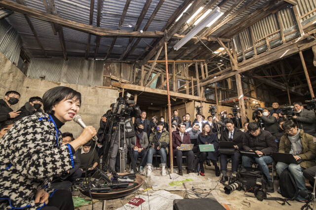 손혜원 전 의원이 2019년 1월23일 전남 목포 역사문화거리 박물관 건립 희망지에서 기자회견을 열고 부동산 투기 의혹에 대한 입장을 밝히고 있다. 연합뉴스