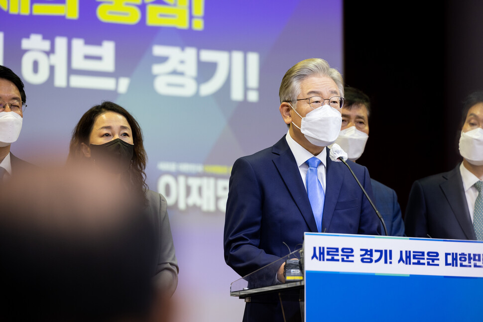 이재명 경기지사가 3일 경기도의회에서 경기도 관련 대선 공약을 발표하고 있다.