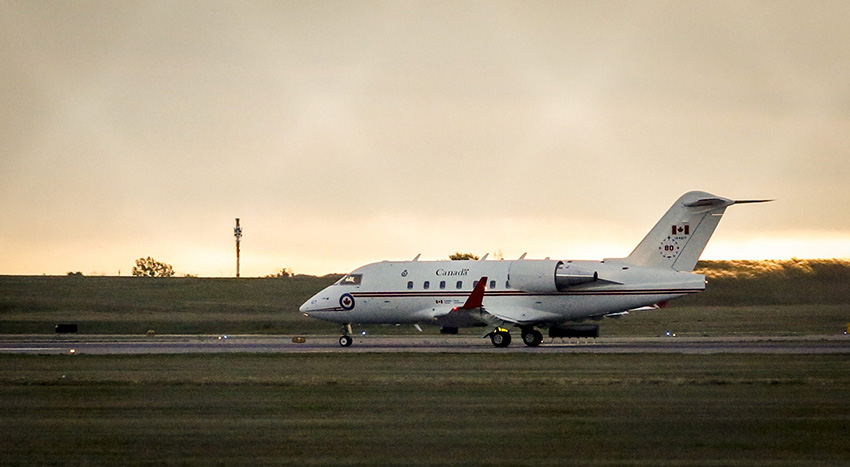 중국에서 석방된 캐나다인 2명을 태운 캐나다군 항공기가 캘거리국제공항에 도착하고 있다.