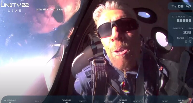 우주 비행기 '유니티'에 탑승한 브랜슨은 온라인 중계방송을 통해 "일생의 경험"이라고 외쳤고 비행을 성공적으로 마친 뒤 축하 무대에 올라 샴페인을 터트렸다.