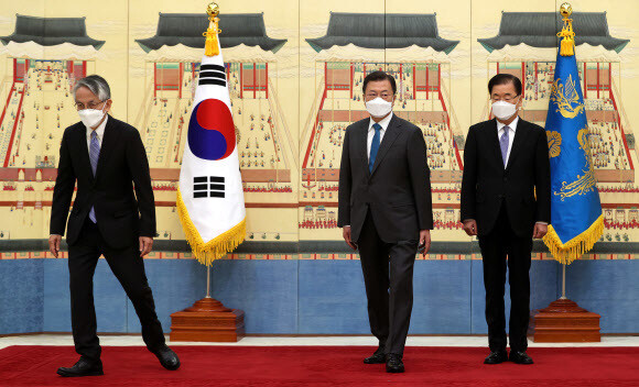 이에 더해 일본군 ‘위안부’ 배상 관련 2차 재판의 선고일이 21일로 다가오는 등 악재가 겹겹이 쌓여 있다. 법원이 지난 1월처럼 국제관습법상 ‘주권면제’ 원칙을 인정하지 않고 원고 승소 판결을 내릴 경우 한-일 관계는 다시 한번 격랑에 휩쓸릴 수밖에 없다. 하지만, 문 대통령은 이날 “지난해 9월 스가 총리님의 취임 축하 통화를 하면서 대화와 협력 의지를 확인할 수 있었다”면서 “협력 정신과 의지가 있다면 어떤 어려운 문제도 헤쳐 나갈 수 있다고 생각한다”며 관계 개선의 뜻은 접지 않았다.