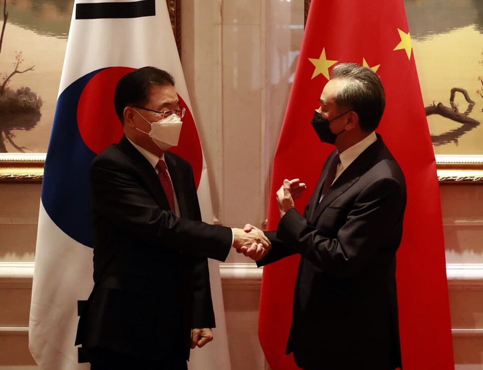 정의용 외교부 장관(왼쪽)이 3일 중국 푸젠성 샤먼에서 열린 한-중 외교장관 회담에 앞서 왕이 중국 외교부장과 악수를 하고 있다. 샤먼/연합뉴스