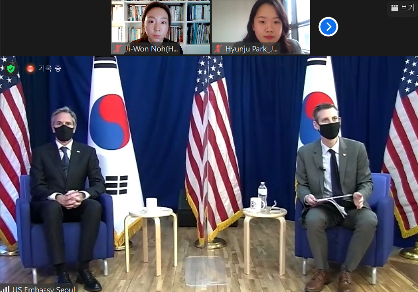 ‘언론계의 새로운 목소리들을 위한 원탁회의’ (Roundtable for emerging voices in Journalism)라는 이름으로 한국 기자들과 비대면 화상 회의를 열었다. 이날 오전 한-미 외교·국방(2+2) 장관 회의와 기자회견이 끝난 뒤 곧바로 한국 언론을 따로 만난 것이다. 주한 미국 대사관은 젊은 기자들의 참신한 목소리를 들어보겠다며 회의 참석자를 20~30대 연령으로 제한했고, 국내 신문·방송·통신사 기자 12명이 참여했다. 블링컨 장관이 기자들과 대화를 나누며 질문에 답변하는 방식으로 이뤄졌고 에드워드 프라이스 미 국무부 대변인이 진행을 맡았다.