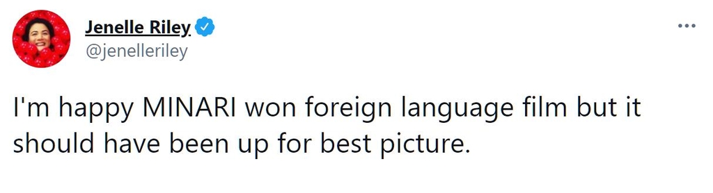 아이디 '루시'는 "미나리는 상을 받았지만, 잘못된 부문에서 수상했다"고 지적했고 '와일드 샷'은 "미나리가 골든글로브 작품상을 받을 자격이 있다는데 우리 모두가 동의할 것"이라고 말했다.