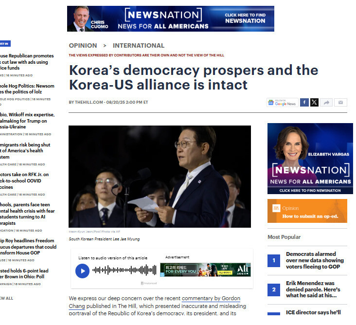 미국의 의회 전문지 ‘더 힐’에 게재된 주미 한국대사관의 기고. 더 힐 누리집 갈무리