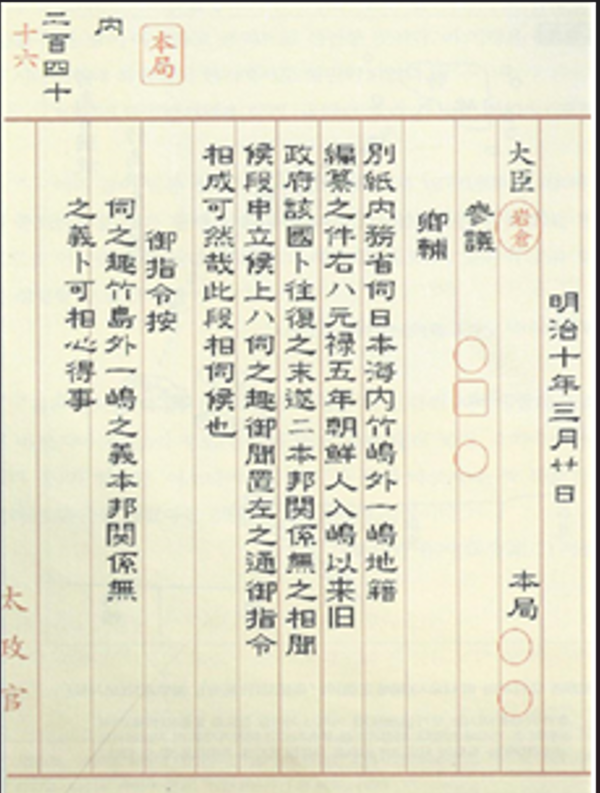 메이지 정부 태정관은 "독도와 울릉도는 일본땅이 아니다"라고 기록했다.