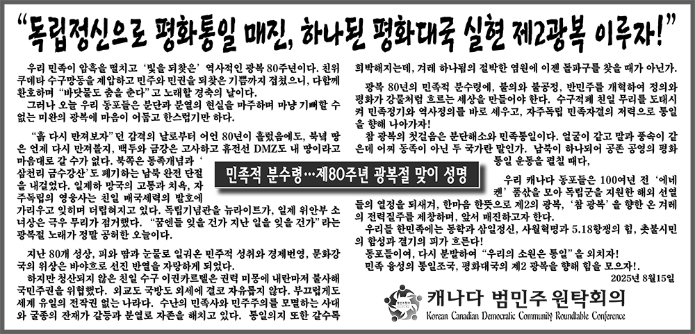 캐나다 범민주원탁회의(KCDCRC: Korean Canadian Democratic Community Roundtable Conference: 의장 김종천)가 광복 80주년을 맞으며‘독립정신으로 평화통일 매진, 하나 된 평화대국 실현 제2광복 이루자!’는 제하의 성명을 발표했다.