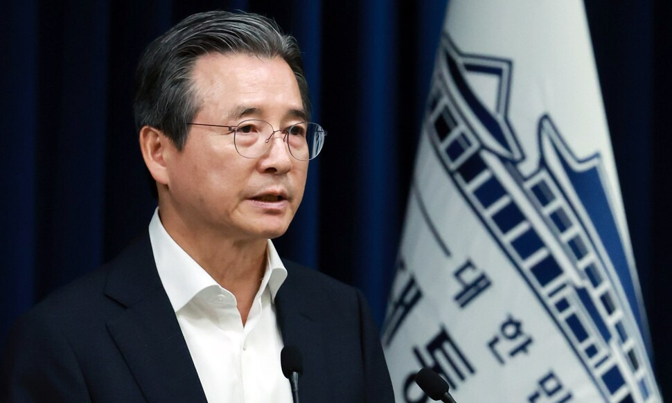 한미 관세 협상 타결, 취재진 질문에 답하는 김용범 정책실장 = 김용범 대통령실 정책실장이 31일 서울 용산 대통령실 청사에서 한미 관세 협상 타결 관련 브리핑 뒤 취재진의 질문에 답하고 있다. 2025.7.31