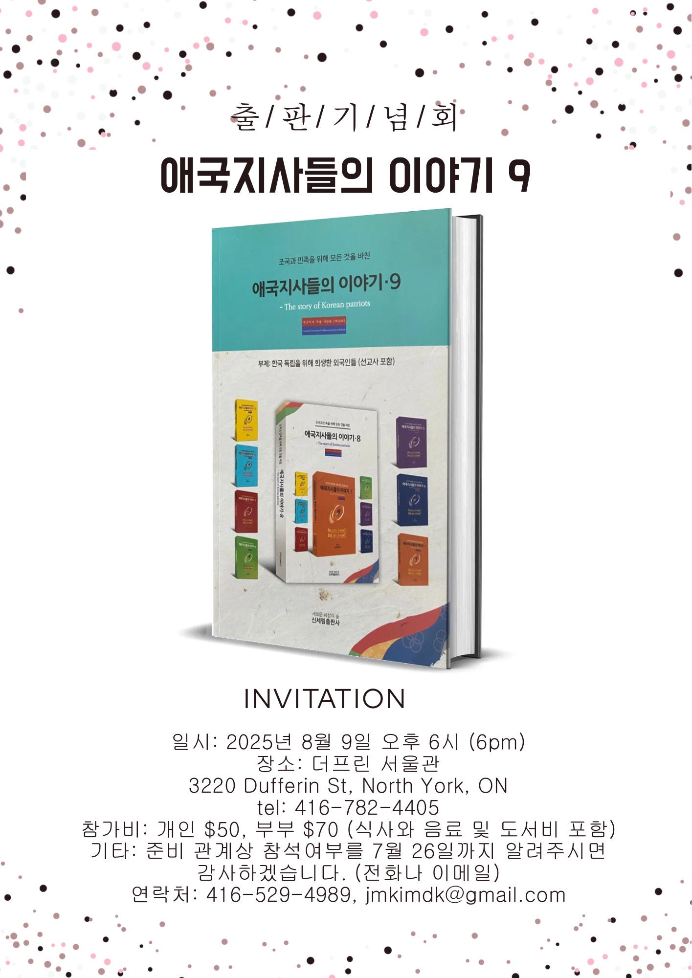 캐나다 애국지사 기념사업회(회장 김정만)는 올해 광복 80주년을 맞아 ‘애국지사들의 이야기’ 시리즈 제9권을 출간, 오는 8월9일(토) 오후 6시 더퍼린 서울관에서 출판기념회를 개최한다고 밝혔다.