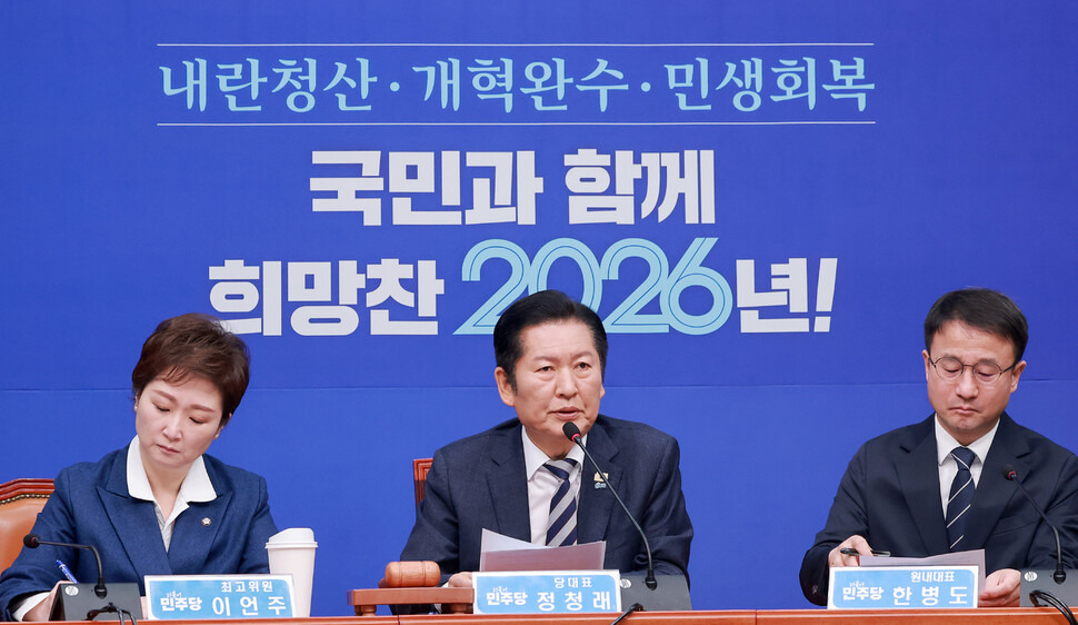 더불어민주당 지도부가 4일 조국혁신당과의 합당 문제를 놓고 또다시 공개적으로 충돌했다. 합당을 제안한 정청래 대표와 합당에 반대하는 위원들은 지난 2일 충돌 때 표정을 붉혔던 것과 달리 이날 서로 웃는 모습을 보였지만 발언 수위는 낮아지지 않았다.