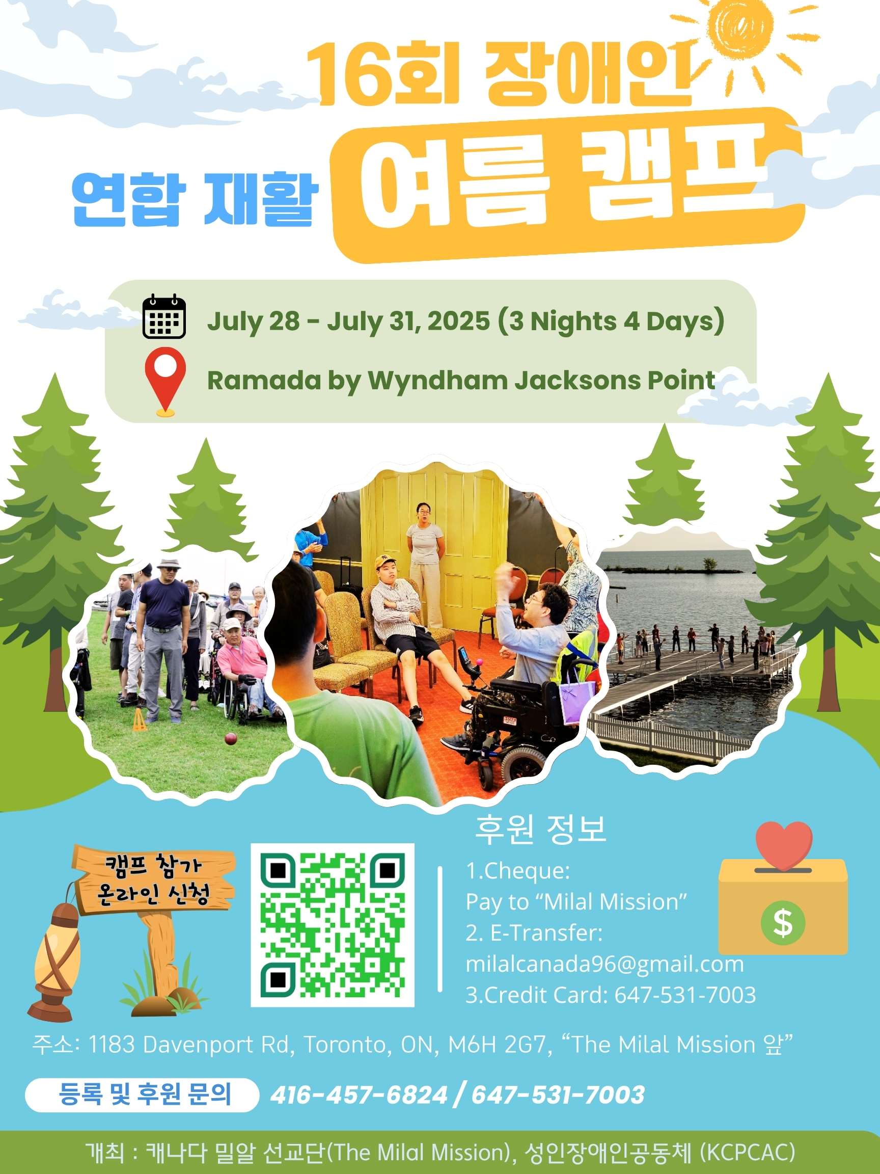 성인장애인 공동체(대표 이성민)와 밀알선교단(단장 박선강)이 공동주최하는 ‘2025 장애인 연합 재활 여름캠프’가 7월28일(월)부터 31일(목)까지 3박4일간 심코호변 Ramada by Wyndham Jacksons Point (49 Lorne St, Jacksons Point, ON)에서 개최된다.