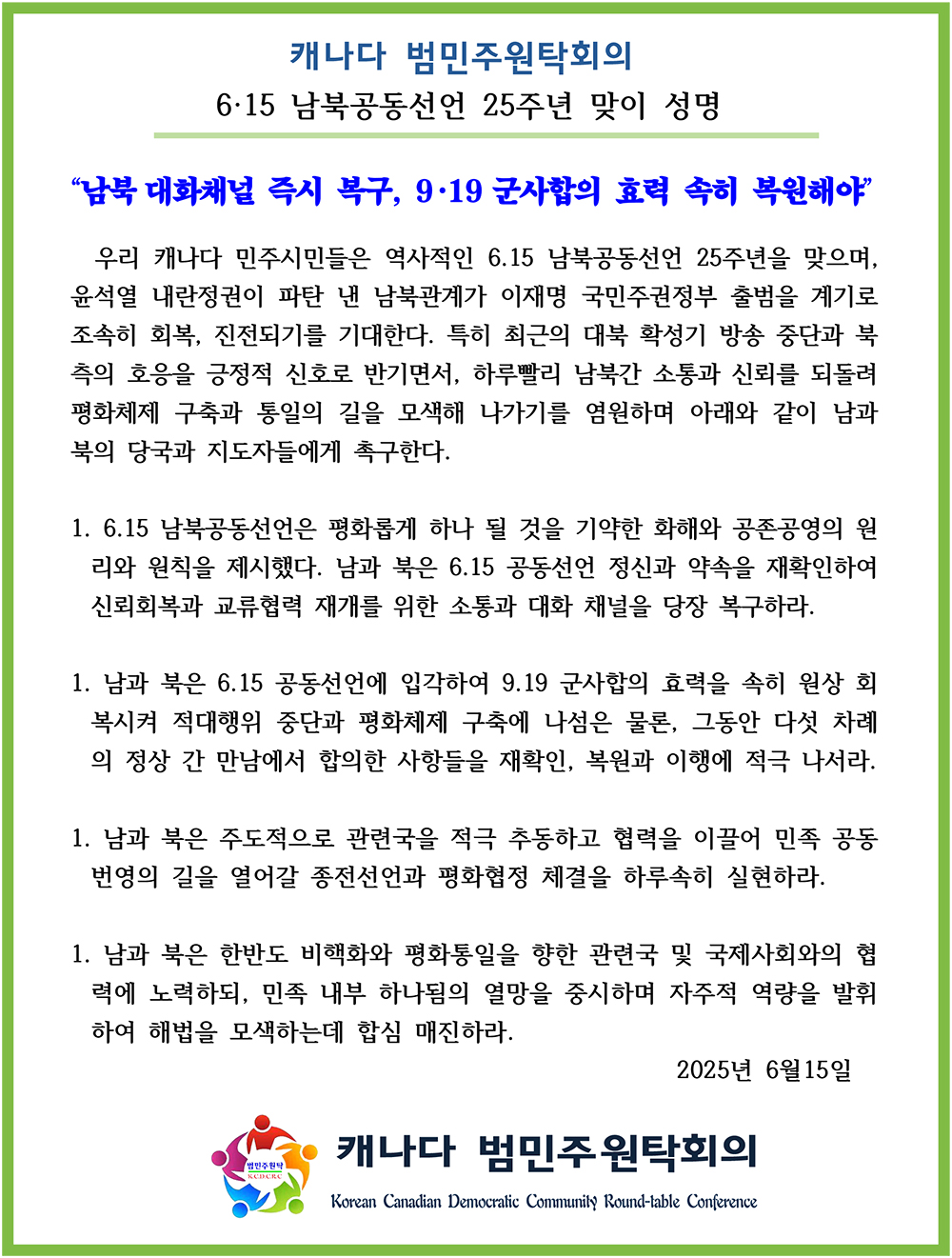 캐나다 범민주원탁회의는 6.15 남북공동선언 25주년을 맞아 성명을 내고 남북 대화채널 즉시 복구와 9.19 군사합의 효력을 속히 복원할 것을 남북 양측에 촉구했다.