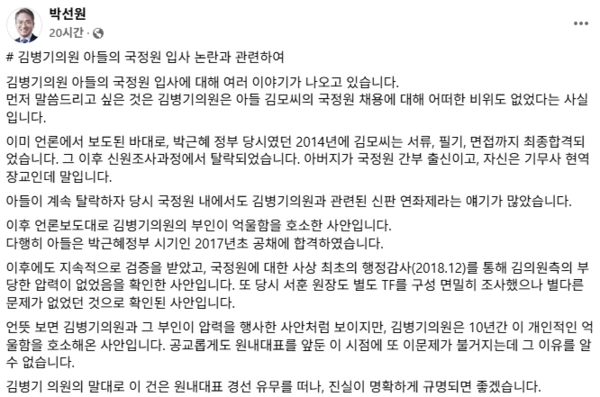 민주당 김병기 의원의 아들이 국정원에 채용되는 과정에 어떠한 비위도 없었다는 박선원 의원의 페이스북 글