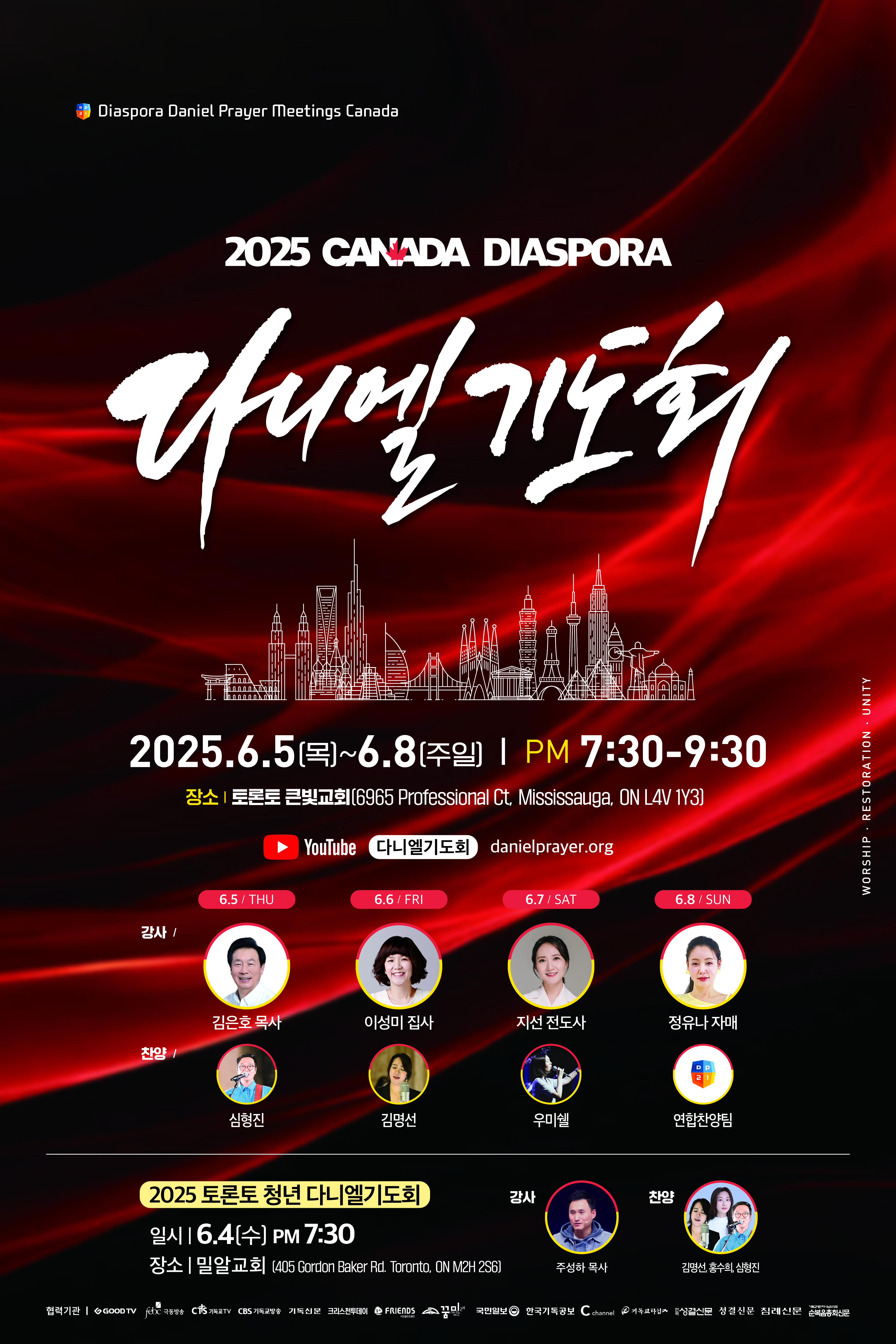 다니엘 기도회는 서울 오륜교회가 1998년부터 시작한 디아스포라 한인교회들의 영적 회복을 위한 초교파 연합기도회로, ▲말씀·찬양·기도로 ‘성령의 강력한 임재가 있는 예배’(Worship) ▲목회자·성도·가정이 회복되는 ‘온전한 치유와 변화가 있는 회복’(Restoration), ▲교회·성도·기도의 연합을 이루는 ‘교단과 교파를 초월한 연합’(Unity)을 3대 핵심가치로 한다. < 문의: 905-677-7729, www.lkpc.org >