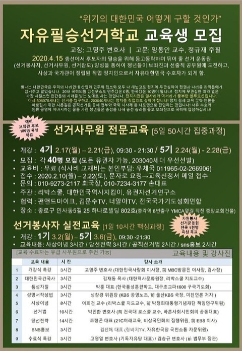 김 후보와 리박스쿨의 관련성을 보여준다며 민주당이 제시한 근거는 더 있다. 2017년 손 대표가 세운 프리덤칼리지장학회는 1년 뒤 ‘2020 총선 필승! 선거입문 정치교실 1기 수강생 모집’ 공고를 냈는데, 강사 명단에 김 후보의 이름이 있다. 2020년 리박스쿨 등 극우단체들이 주관한 ‘자유필승선거학교 교육생 모집’ 공고문에는 김 후보가 운영하는 김문수티브이가 협력사로 등장한다.