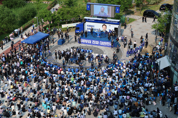 30일 더불어민주당 이재명 대선 후보의 유세가 열린 강원도 원주시 반곡동 원주행복마당에서 지지자들이 이 후보의 연설을 듣고 있다. 2025.5.30 연합