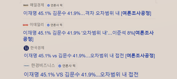 '이재명-김문수 후보 접전'이라는 여론조사 결과를 전하는 언론의 제목들.