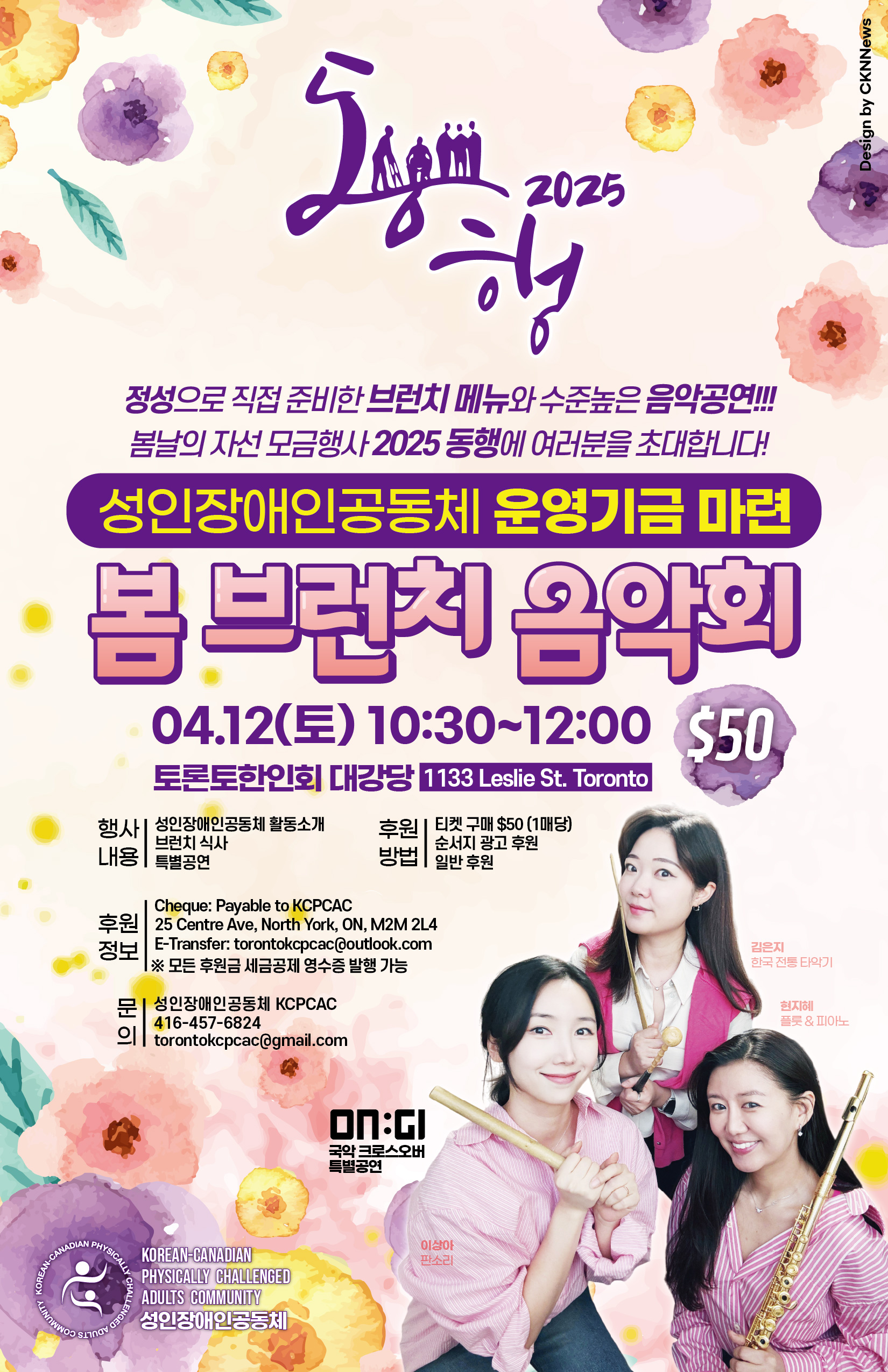 올해로 창립 28주년을 맞이한 성인 장애인공동체(KCPCAC: 회장 이성민)가 운영기금 마련을 위한 봄 연례행사인 후원모금 브런치 음악회 ‘2025 동행’을 4월12일(토) 오전 10시30분부터 낮 12시까지 토론토 한인회관(1133 Leslie St. North York)에서 개최한다.