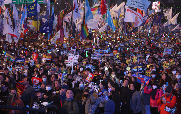 야5당 범국민대회에 이어 같은 자리에서 오후 5시부터 '윤석열 즉각 퇴진! 사회대개혁! 16차 범시민대행진'이 이어졌다. 주최 쪽 추산 100만 명이 참가했다. 지난주와 비슷한 수의 시민들이 광화문 광장을 가득 메웠다. 형형색색의 깃발과 응원봉, 종이팻말 등이 끝도 없이 늘어졌다. 시민들은 "헌재는 윤석열을 파면하라" "더 이상 기다릴 수 없다 파면하라" 등의 구호를 외쳤다.