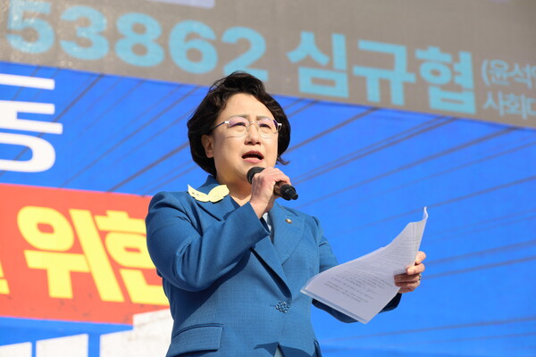 22일 서울 종로구 동십자각 앞에서 열린 야5당 공동 비상시국 범국민대회에서 김선민 조국혁신당 당 대표 권한대행이 연설을 하고 있따 .2025.3.22. 조국혁신당 제공