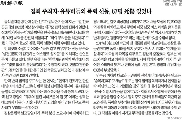 “지금 같은 평화 집회로 탄핵을 막을 수 있을까.(…) 지금쯤이면 곳곳에서 유혈 충돌이 벌어지며, 횃불과 가스통이 집회에 등장해야 정상이다.”(한정석 전 선거방송심의위원, 2월 22일 페이스북 게시글)