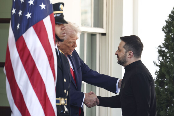 도널드 트럼프 미국 대통령(왼쪽)이 28일 백악관 입구에서 볼로디미르 젤렌스키 우크라이나 대통령을 맞아 인사를 나누고 있다. 2025.2.28. UPI 연합
