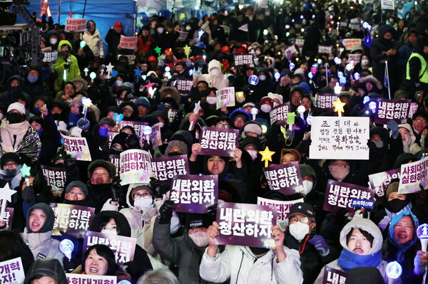 ▲지난 2024년 12월 14일 윤석열즉각퇴진·사회대개혁 비상행동 주최로 서울 영등포구 국회 앞에서 열린 '내란수괴 윤석열 즉각 탄핵 범국민 촛불 대행진'에서 시민들이 윤석열 대통령의 탄핵소추안 표결에서 탄핵 투표가 가결된 뒤 응원봉을 흔들며 노래를 합창하고 있다.이정민