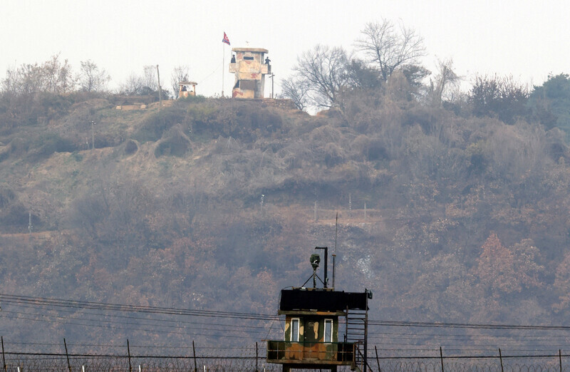 북한이 군사정찰위성 1호인 ‘만리경-1’호를 3차 발사한 다음날인 22일 오전 경기도 파주시 자유로 너머로 남한 초소(아래쪽)와 북한 초소가 마주보고 있다. 신소영 기자 viator@hani.co.kr