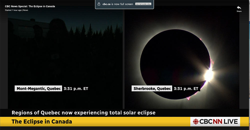퀘벡주는 몬트리올 시내, 셔브룩, 생조지스에 이어 프린스에드워드 섬의 서쪽 절반뿐만 아니라 뉴브런즈윅 중북부 전역에 걸쳐 약 3분여 동안씩 많은 부분 맑은 하늘로 관찰자들을 즐겁게 했다. .