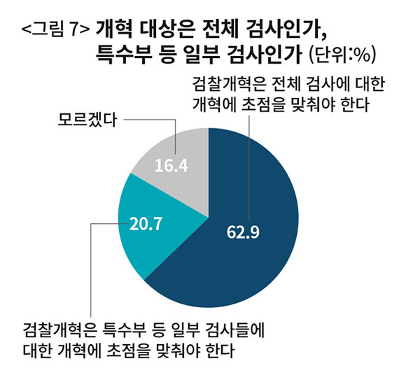 어떤 검찰개혁 방안을 더 선호하는지 물으면서 검찰개혁 방안 10가지를 제시했더니 '위법한 잘못을 저지른 검사를 파면할 수 있는 제도적 장치가 마련되어야 한다'가 찬성 84.5%로 1위를 차지했다. '검사는 법률 전문가이므로 검찰개혁은 그들 자신의 손에 맡기는 것이 옳다'라는 방안은 찬성이 21.5%밖에 안 나와 10가지 방안 가운데 최하위를 기록했다. 시사IN은 이 같은 대국민 여론조사의 전반적인 데이터를 토대로 검찰 집단에 우호적인 이들의 범위는 대략 17~32%인 반면 부정적인 이들은 57~72%에 달한다고 분석했다.
