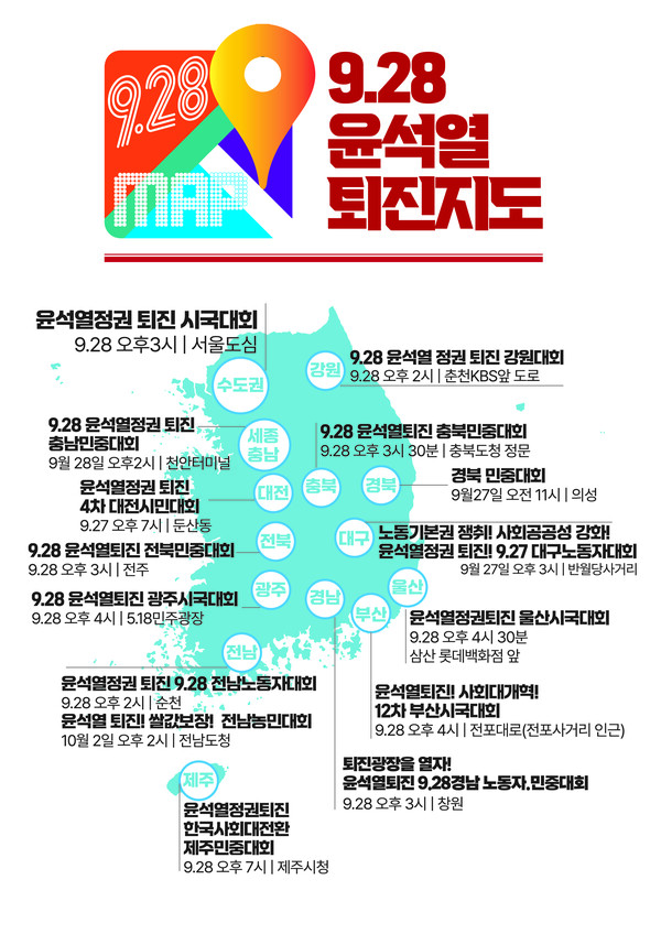 아울러 "9월 28일 오후 3시 서울 도심을 비롯한 수도권 일원과 전국 각지에서 동시다발로 함께 들고 일어나, 나라를 지키고 바로잡을 새로운 전망을 제시해, 국민의 대의기관인 국회에서 곧바로 논의하도록 하자"고 9‧28 윤석열 정권 퇴진 시국대회 참여를 독려했다.