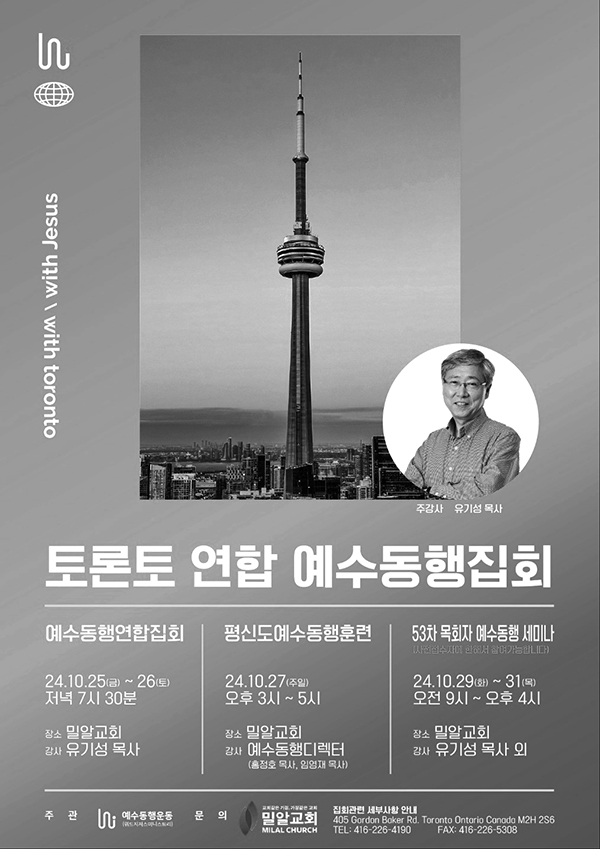 밀알교회(담임 박형일 목사: 405 Gordon Baker Rd.North York, M2H 2S6)는 ‘예수동행운동’(With Jesus Ministry)이 주관하는 토론토 연합 예수동행집회를 10월25일(금)부터 31일까지 개최한다. 이번 예수동행집회는 유기성 목사(선한목자교회)를 주강사로 먼저 이틀간의 연합집회에 이어 일일 평신도 예수동행훈련, 그리고 목회자와 사모, 전도사, 선교사 등을 대상으로 하는 제53차 목회자 예수동행 세미나가 사흘간 진행된다.