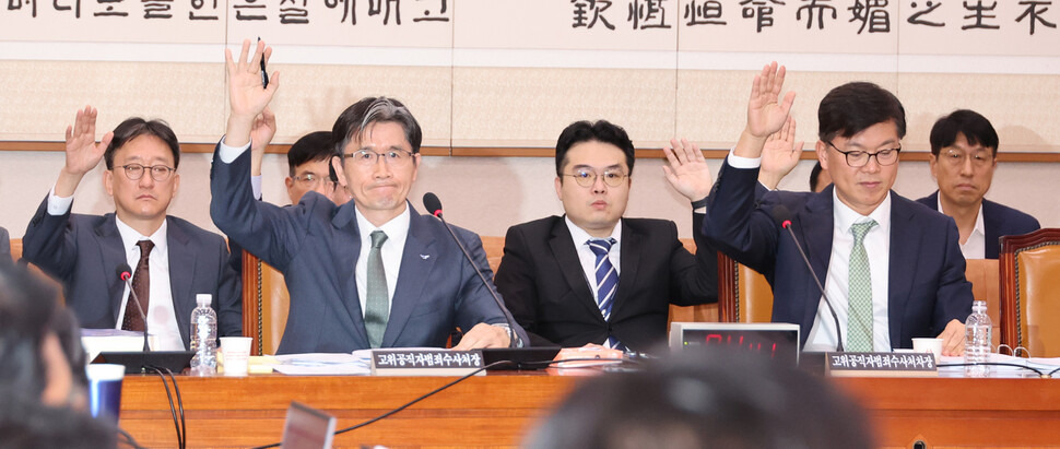 여당은 공수처의 공소제기 실적이 미흡하다며 ‘공수처 무용론’을 제기했다. 박준태 국민의힘 의원은 “공수처는 미진한 수사력, 수사지연, 절차 위반, 압수수색, 황제수사, 보안유출 등 끊임없이 논란의 중심에 섰다”며 “오늘부로 공수처는 폐지해야 한다”고 했다. 그러면서 공수처가 지난해 2400건의 사건을 접수하고 공소제기 실적이 없다는 점을 꼬집었다. 같은 당 곽규택 의원이 “공수처가 수사기관의 제 역할을 하기 때문에 존속해야 한다는 데 동의하시는 분은 손들어보라”고 하자 공수처 쪽 기관 증인으로 참석한 오 처장을 비롯한 부장검사 등이 모두 손을 들었다. < 정혜민 강재구 기자 >