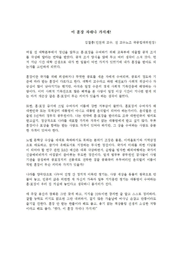 국립 인천대학교 김철홍 교수가 대통령 훈장을 거부하며 쓴 ‘이 훈장 자네나 가지게’