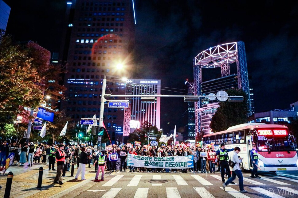 촛불행동은 이날 시청역을 시작으로 청계광장, 을지로 일대를 거쳐 다시 본 행사장으로 돌아오는 도심 행진을 펼쳤다. 이들은 “우크라참전 한반도전쟁 윤석열을 타도하자”, “공천개입 국정농단 김건희를 몰아내자” 등의 구호를 외쳤다. < 한겨레 박고은 기자 >