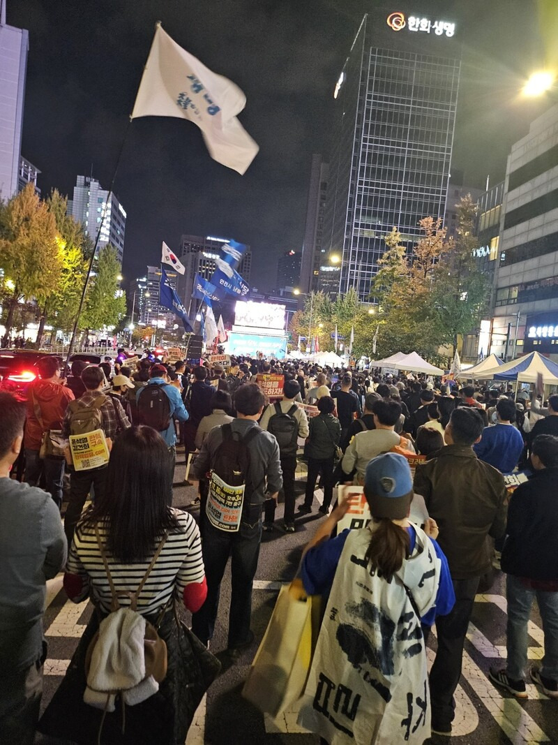 윤석열 대통령의 공천 개입 정황이 담긴 명태균씨와의 통화 녹취가 공개된 뒤 첫 주말인 2일 저녁 서울 중구 시청역 7번 출구 앞에서 ‘윤석열 퇴진 김건희 특검 113차 촛불대행진’이 열렸다. 숭례문 방향 4차선 도로 300m가량을 메운 시민들은 김건희 여사 수사와 대통령 퇴진을 촉구하는 구호를 외치며 갑갑함을 토로했다. 집회를 주최한 촛불행동 쪽은 이날 집회에 연인원 2만여명이 참여한 걸로 추산한다고 밝혔다. 이날 오후 30만명(주최 쪽 추산)이 참여한 더불어민주당의 ‘김건희 윤석열 국정농단 규탄·특검 촉구 국민행동의 날’에 이어, 저녁까지 서울 도심에서 정부를 비판하는 대규모 시민 행동이 이어진 셈이다.
